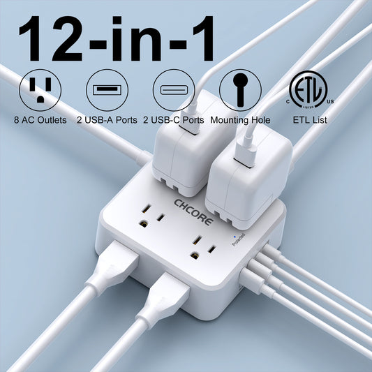 10Ft Surge Protector Power Strip - 8 AC Outlets & 4 USB Ports (2 USB C), 3-Sided Flat Plug Power Strip, ETL Certified, White