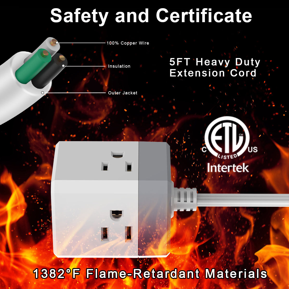 Safe and Eco-friendly: This 5FT heavy-duty extension cord features an eco-friendly, flame-retardant PC shell that withstands temperatures up to 1382℉, providing enhanced safety and durability for daily use.