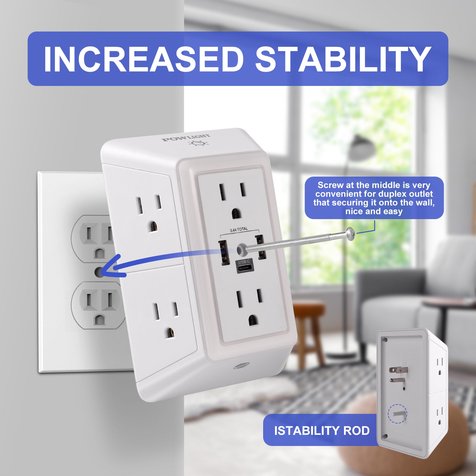 Multi-Functional USB Outlet: This outlet extender features a unique three-sided design with 6 AC outlets and 3 USB ports (including 1 USB-C), allowing you to power multiple devices at the same time with ease.