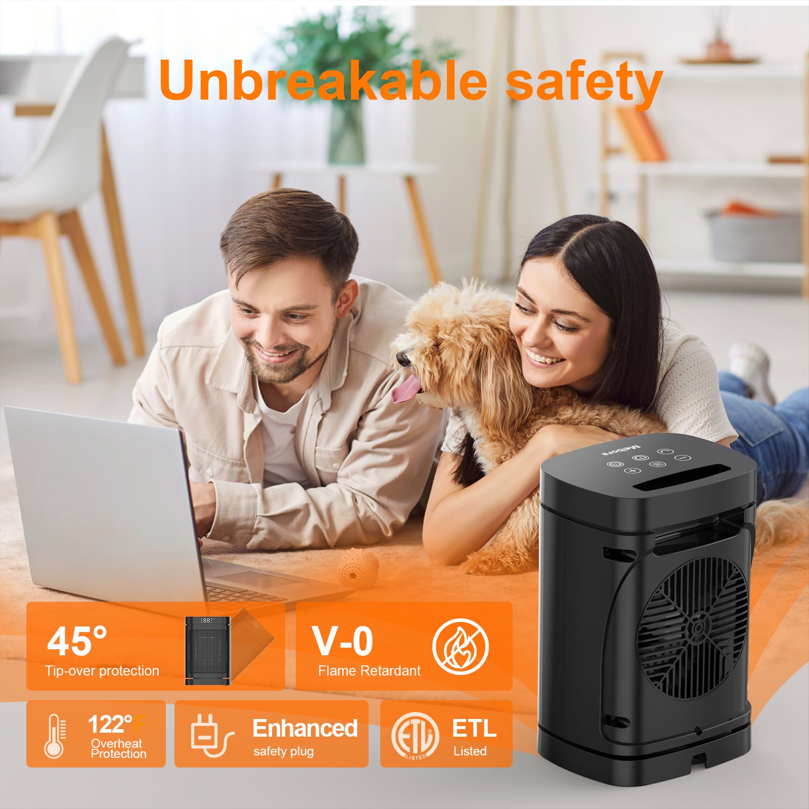 Three Heating Levels: This compact space heater offers three power settings — 700W, 1000W, and 1500W — to flexibly meet different heating needs and ensure fast indoor warmth.