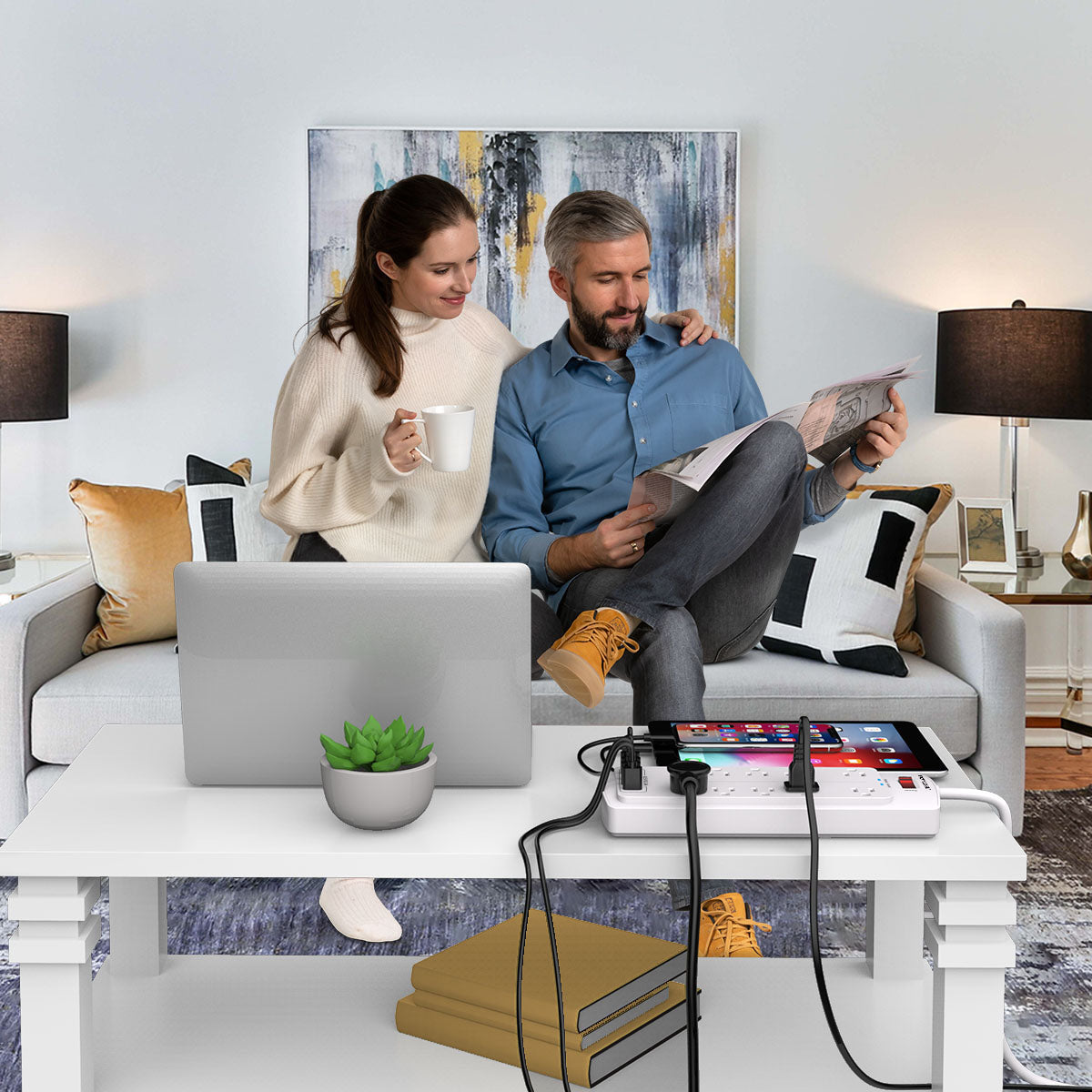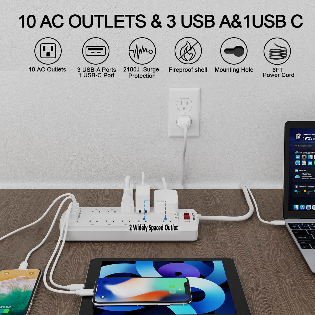 10 AC Outlets + 4 USB Ports: This surge protector power strip features 10 widely spaced AC outlets, ideal for accommodating large plugs without overlap. It also includes 4 USB charging ports (including 1 USB-C), allowing you to power and charge multiple devices simultaneously—perfect for homes, offices, or workstations with high power demands.