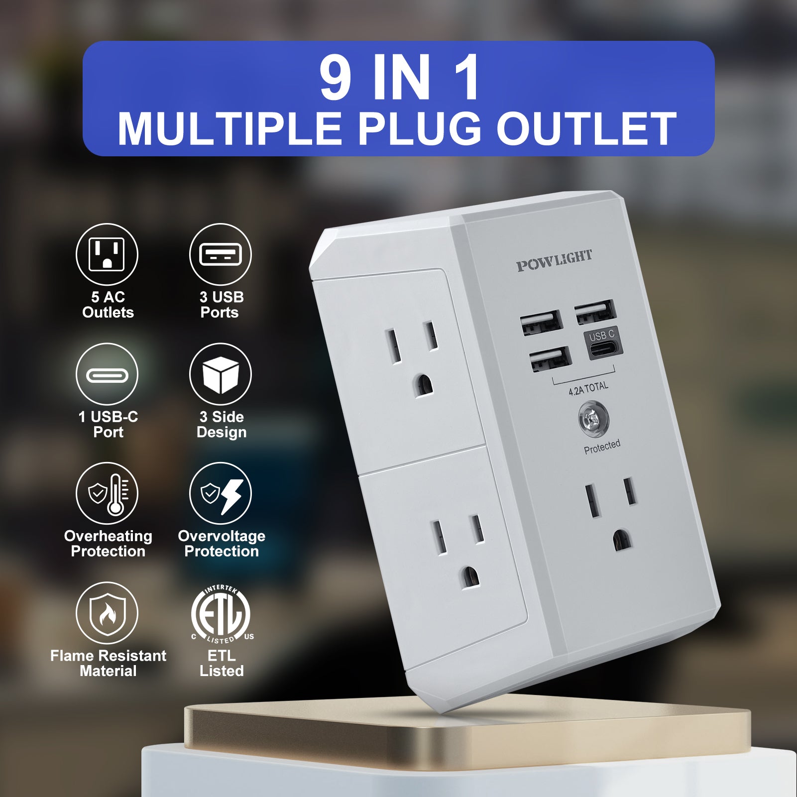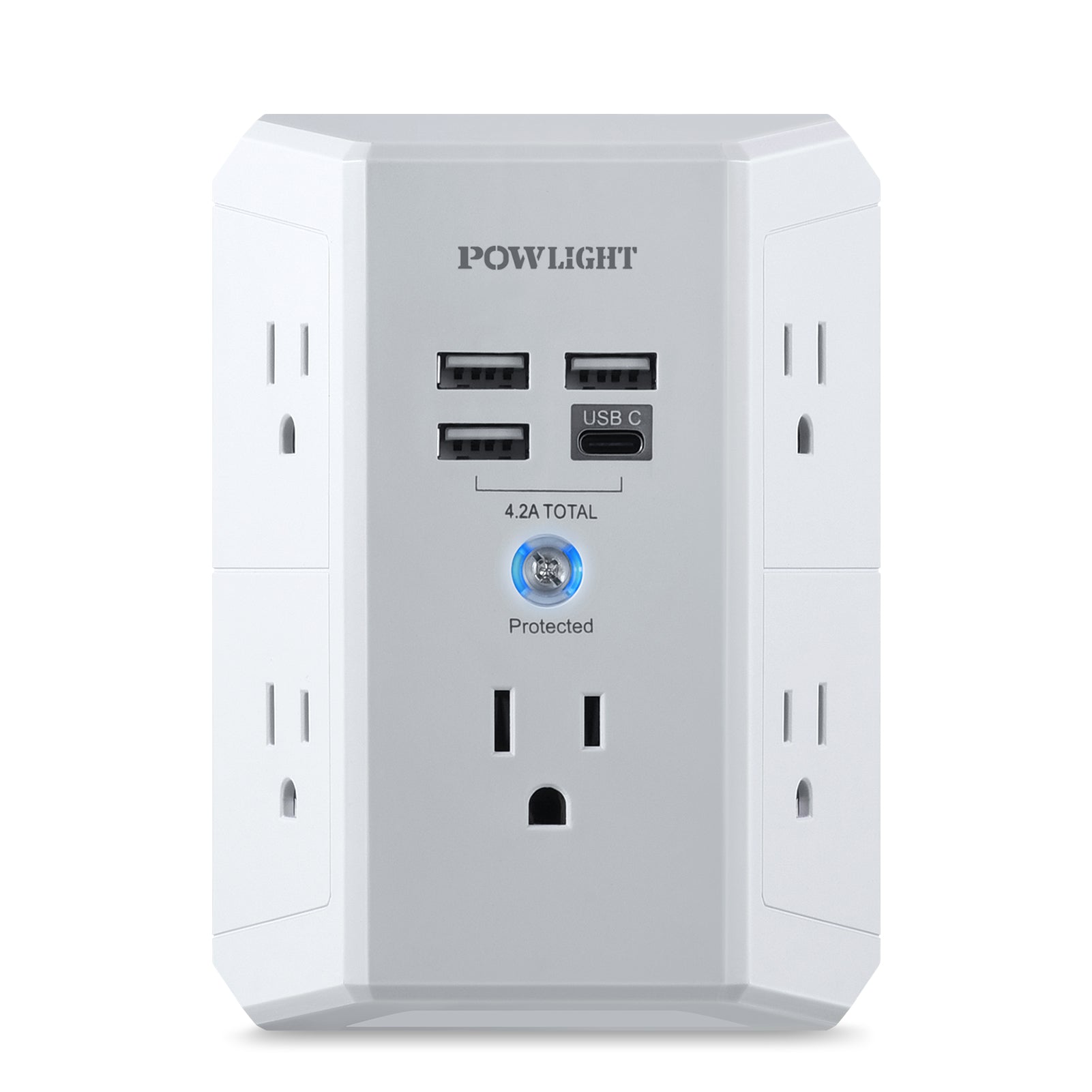 Three-Sided Multi-Plug Design: This multiplug wall outlet features a unique three-sided design with 5 AC outlets and 4 USB ports(1 USB-C). Its compact size allows you to connect multiple devices at once, perfect for home and office use.