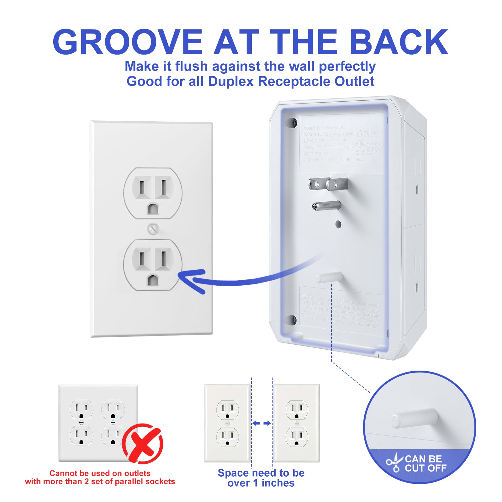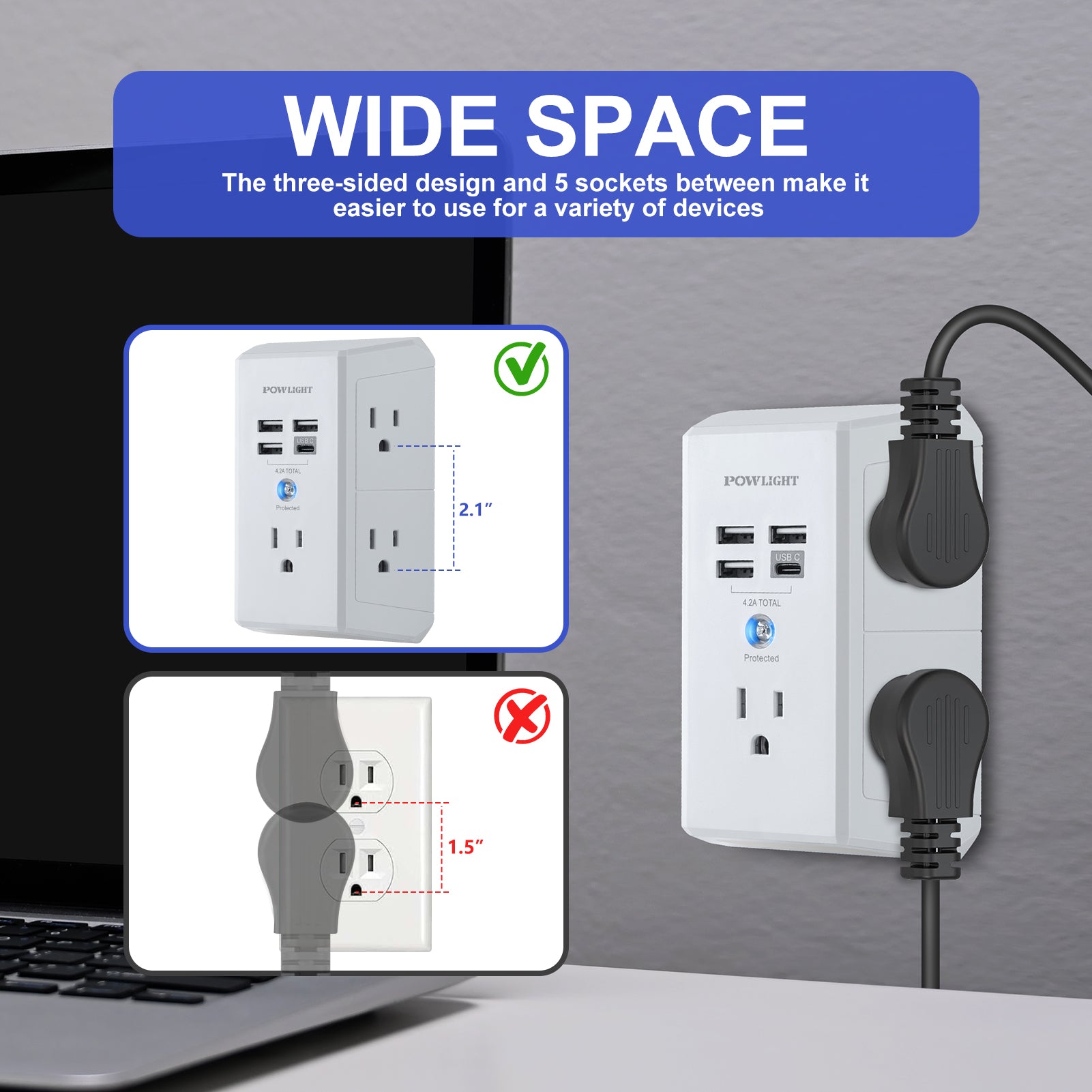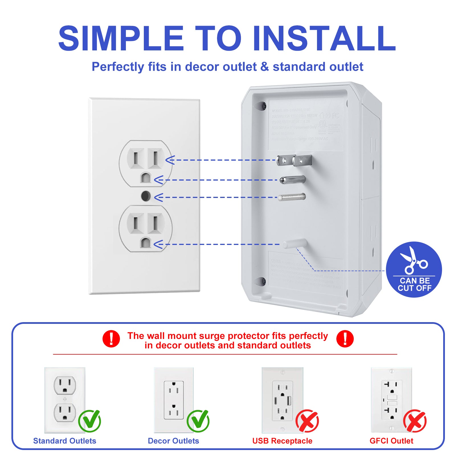 Wide-Spaced Outlets: The surge protector outlet offers 2.1 inches of spacing between AC outlets, allowing bulky plugs to be used simultaneously without blocking each other. Comes with screws to securely fix it to a duplex outlet for stable installation.