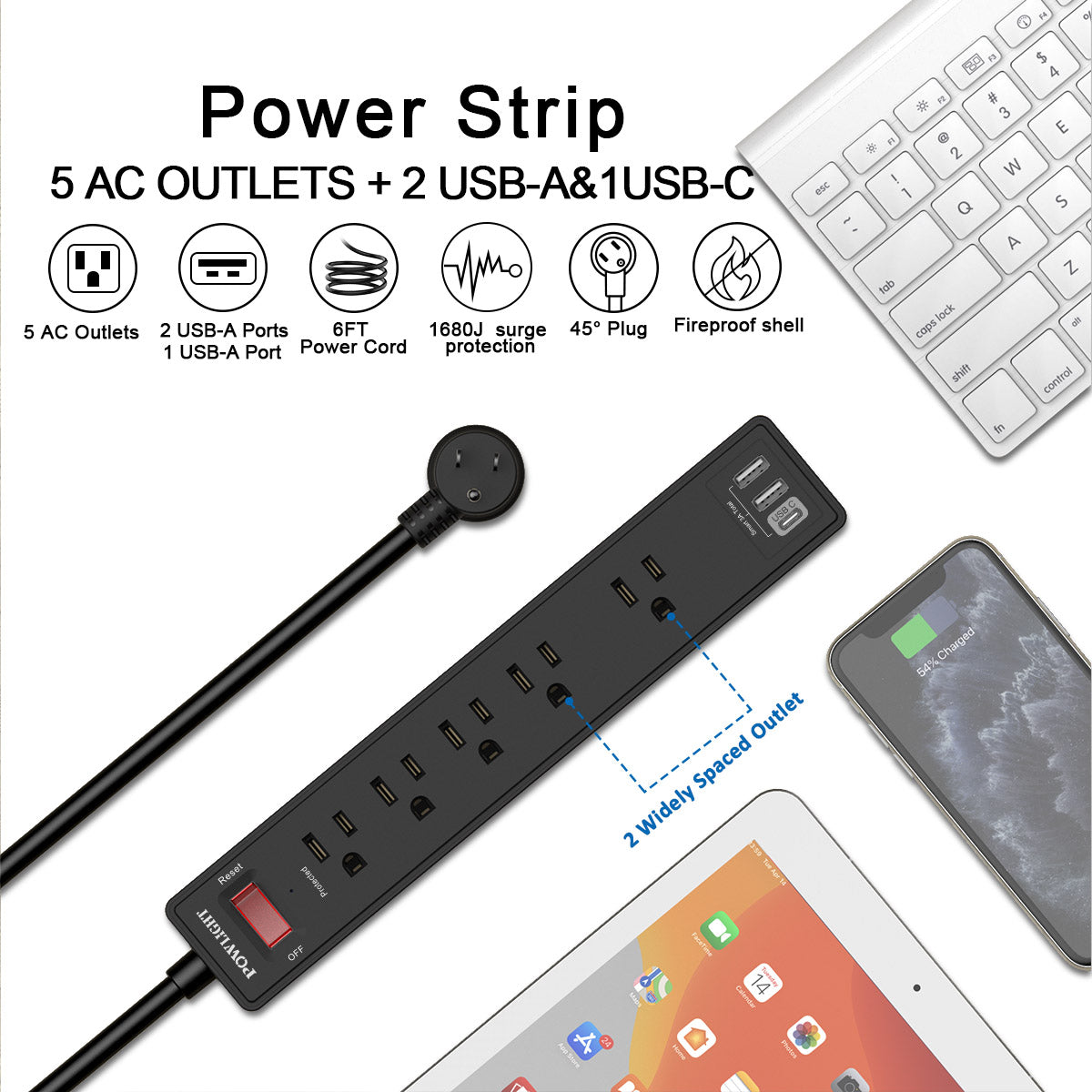 5 AC Outlets + 3 USB Charging Ports: This surge protector power strip is equipped with 5 AC outlets and 3 USB ports (including 1 USB-C), allowing you to power and charge multiple devices simultaneously—ideal for home, office, and various other settings.